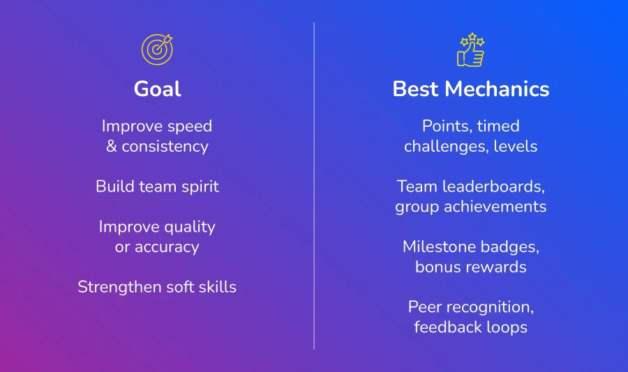 Gamification offers many mechanics, and each of them influences behavior differently. So, depending on the goal, managers might want to choose one or more mechanics to implement. Let us help you by matching some goals with the most appropriate mechanics to apply.